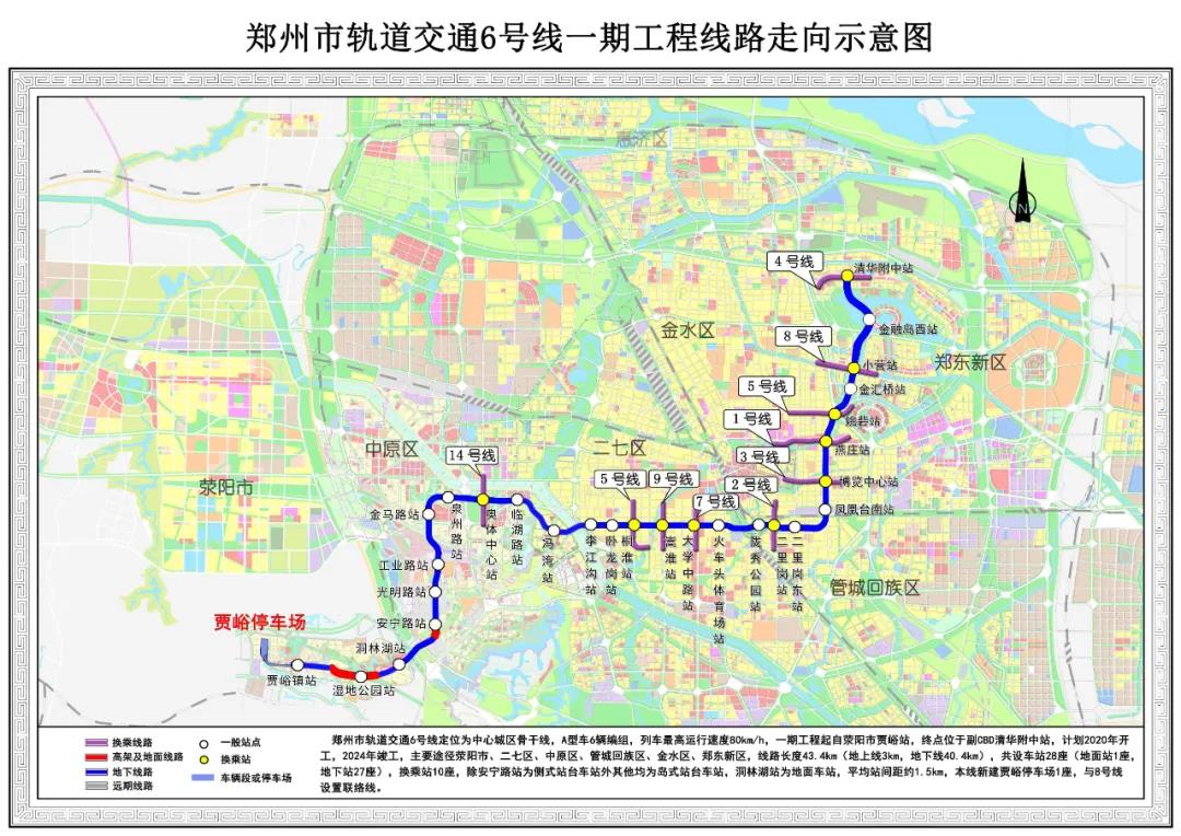 6號(hào)線一期工程西段,起于鄭州西南部滎陽(yáng)市賈峪鎮(zhèn),經(jīng)二七區(qū)馬寨鎮(zhèn),止于中原區(qū)常莊站,全長(zhǎng)17km,線路沿洞林路、文澤路、濱湖南路、奧萊大道、明暉路、常州路、文博大道和凱旋路敷設(shè),在奧體中心站與14號(hào)線一期換乘。